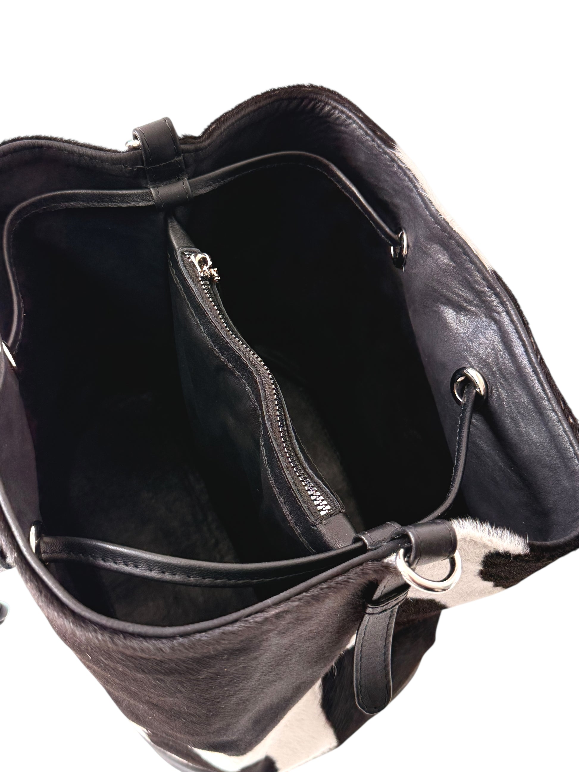 Destaca tu oferta con este Bolso Dama Irlanda en piel combinado de pelo de res atigrado y cuero bovino premium. Su diseño tipo bucket con cordón ajustable y herrajes metálicos realza cualquier look con un toque sofisticado. Hecho artesanalmente con materiales seleccionados para conjugar estilo y funcionalidad.