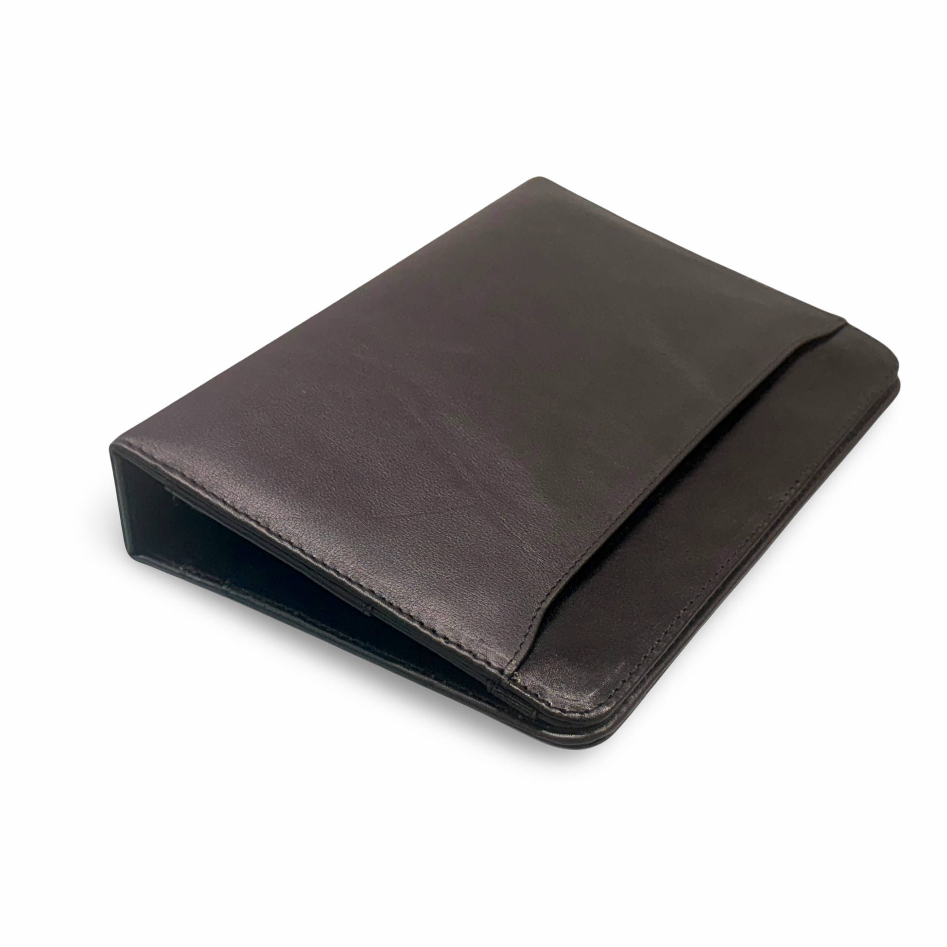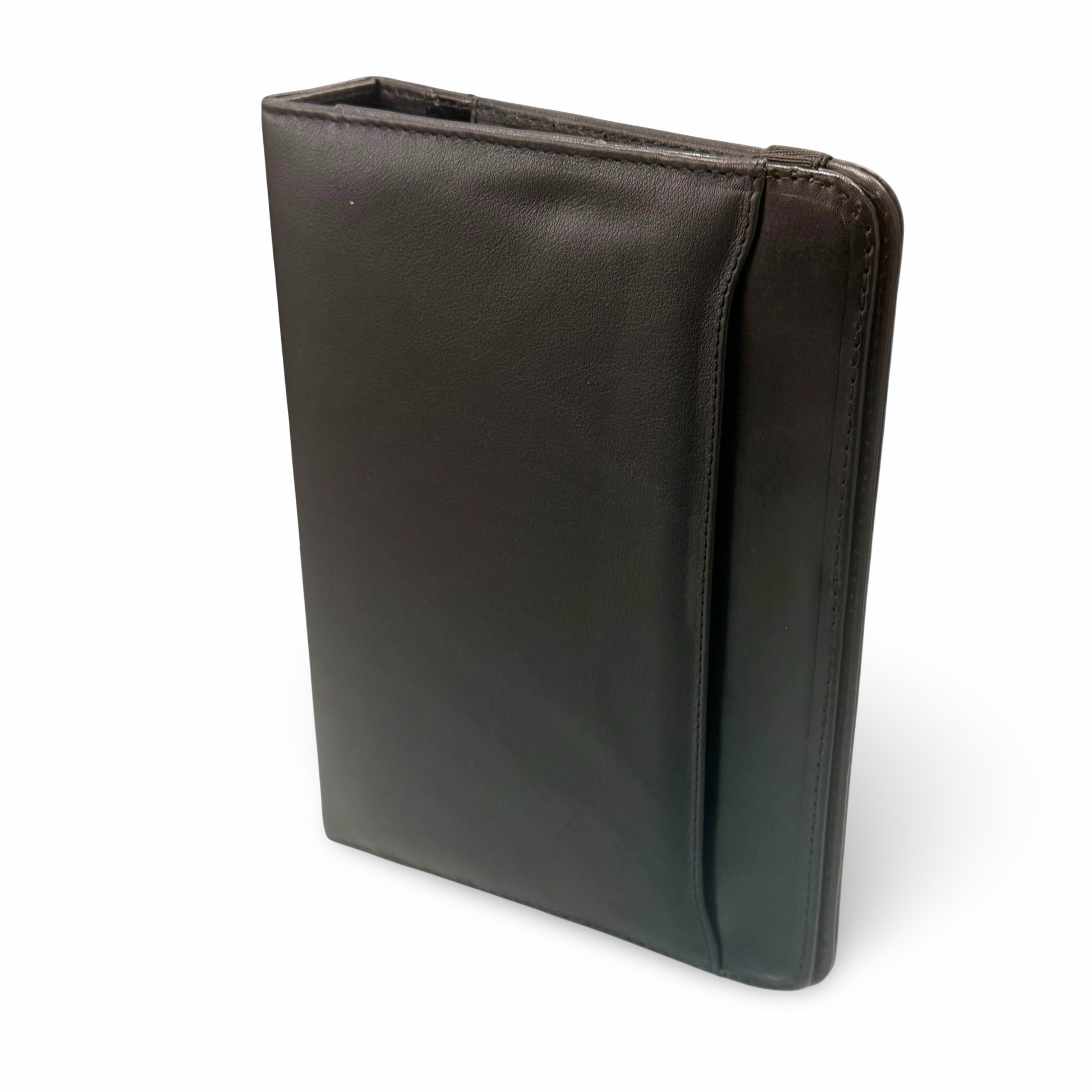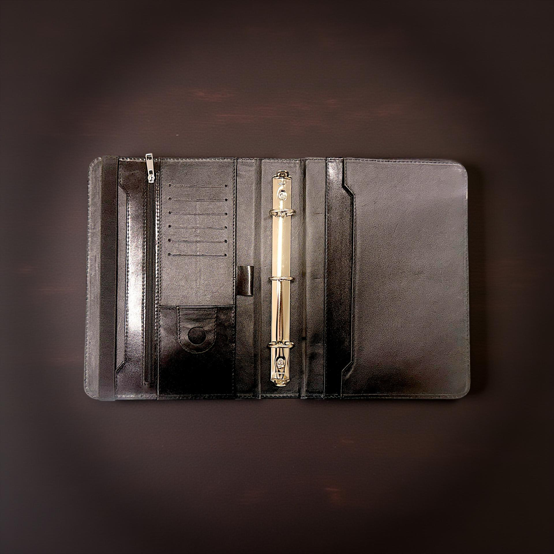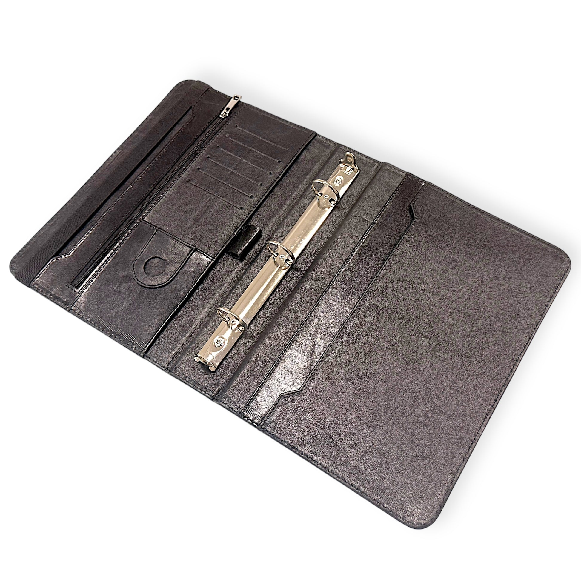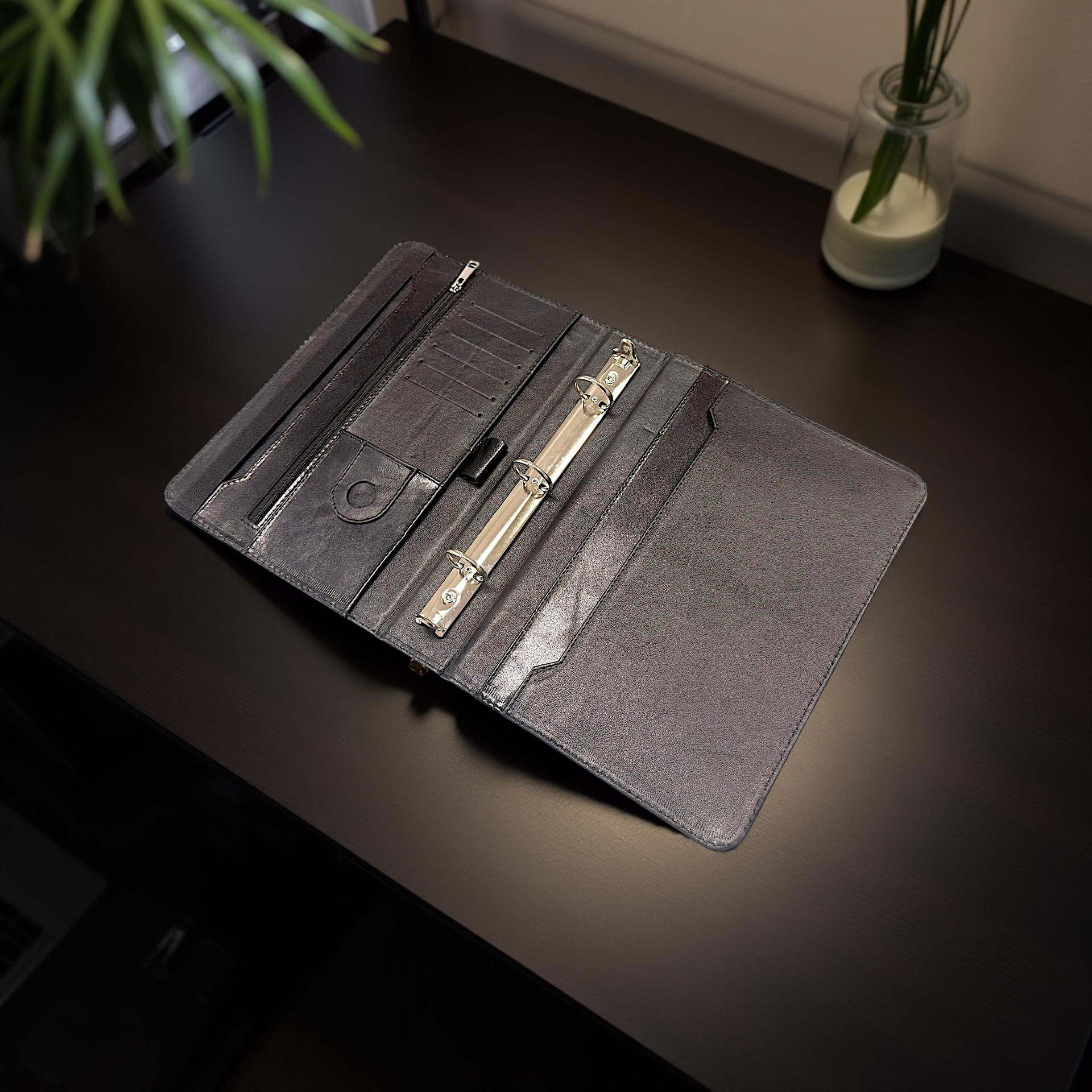 La carpeta Mosvarti media carta es una pieza ejecutiva fabricada artesanalmente en cuero bovino genuino color negro. Diseñada para profesionales que valoran la organización y la presentación impecable, integra argollas metálicas, cierre interior y compartimentos funcionales para tarjetas, documentos y plumas. Ideal para oficinas, despachos, conferencias o regalos empresariales premium.